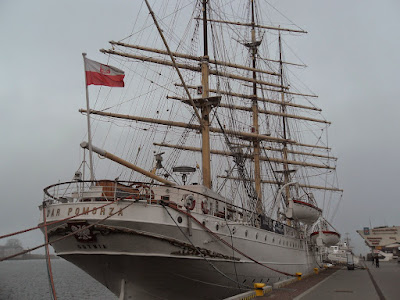 I na koniec morze, zimny Bałtyk, ale jak nie zaliczyć choćby moczenia nóg. Woda lodowata, ale nóg nie urwało. I stojące w porcie statki, Dar Pomorza., jachty, ORP Błyskawica