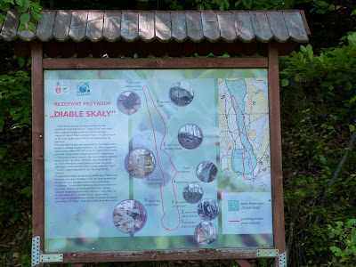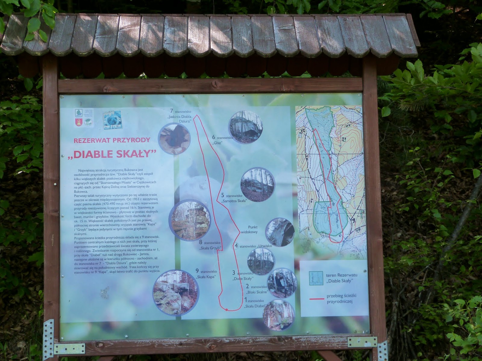 A całkiem niedaleko w Bukowcu, gdzie diabeł mówi dobranoc znajduje się podobny rezerwat, tylko znacznie mniejszy - 9 formacji skalnych ładnie opisanych i wartych zwiedzenia, ważne jest by się tam nie zgubić. Przy jaskini idziemy szlakiem niebieskim w LEWO.